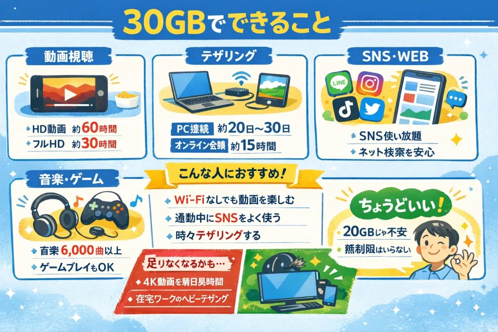 そんな人にとって、30GBはコスパと安心のバランスが取れたベストサイズです。