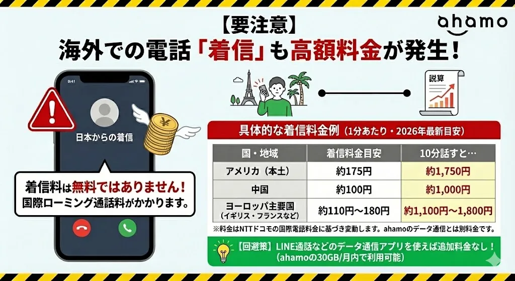 海外での着信通話でも国際通話料金が発生するため注意が必要です。