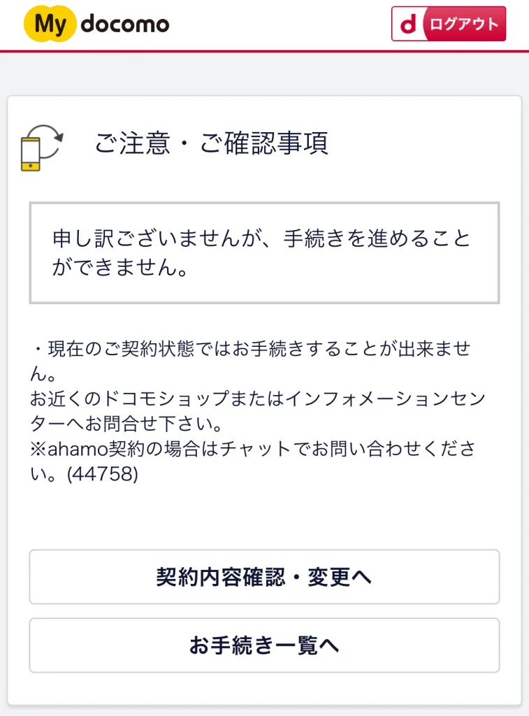 つまり、データプラス回線を残したままahamo回線を解約手続きを行うと、エラーが発生します。