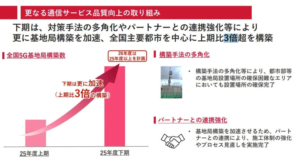 NTTは2025年11月の決算発表にて、通信品質改善のため「2026年3月までに5G基地局の構築ペースを上期比で3倍に引き上げる」と発表しました。