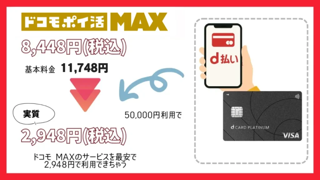 「ドコモ ポイ活 MAX」は、dカードやd払いを活用することで、データ無制限プランが実質2,948円で利用できるサービスです。