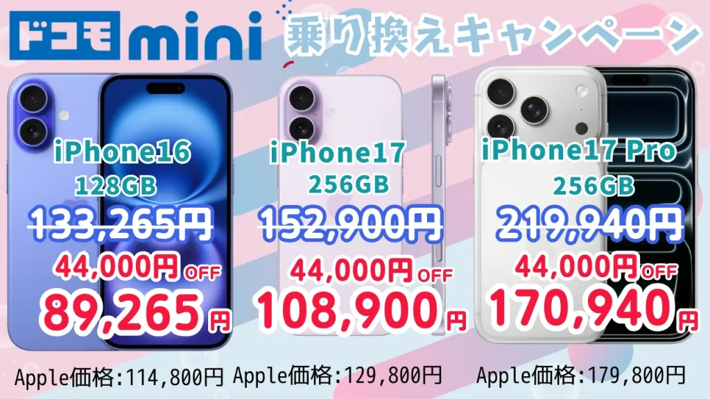 他社からドコモ miniへ乗り換えで、最新のiPhoneが最大44,000円OFFとなり、Apple公式よりもお得に購入できます