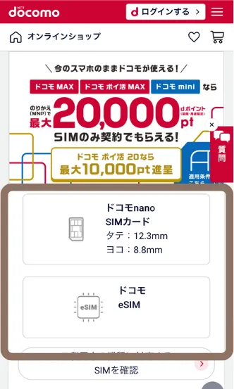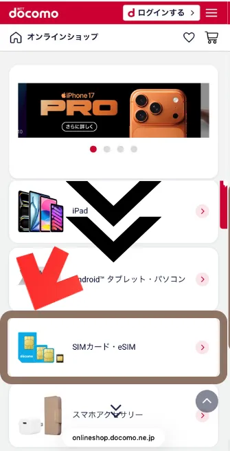 ドコモオンラインショップにアクセスし、SIMのみを申し込む場合は「SIMカード・eSIM」を選択します。