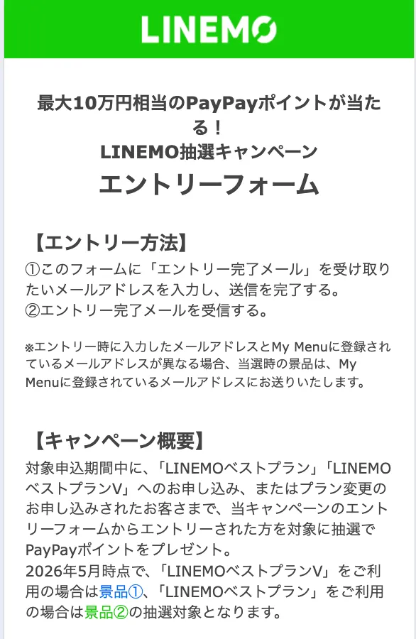 2026年4月6日(月)~2026年4月19日(日)の期間、LINEMOに申し込みをすると最大10万円のPayPayポイントが当たるキャンペーンを実施しています。