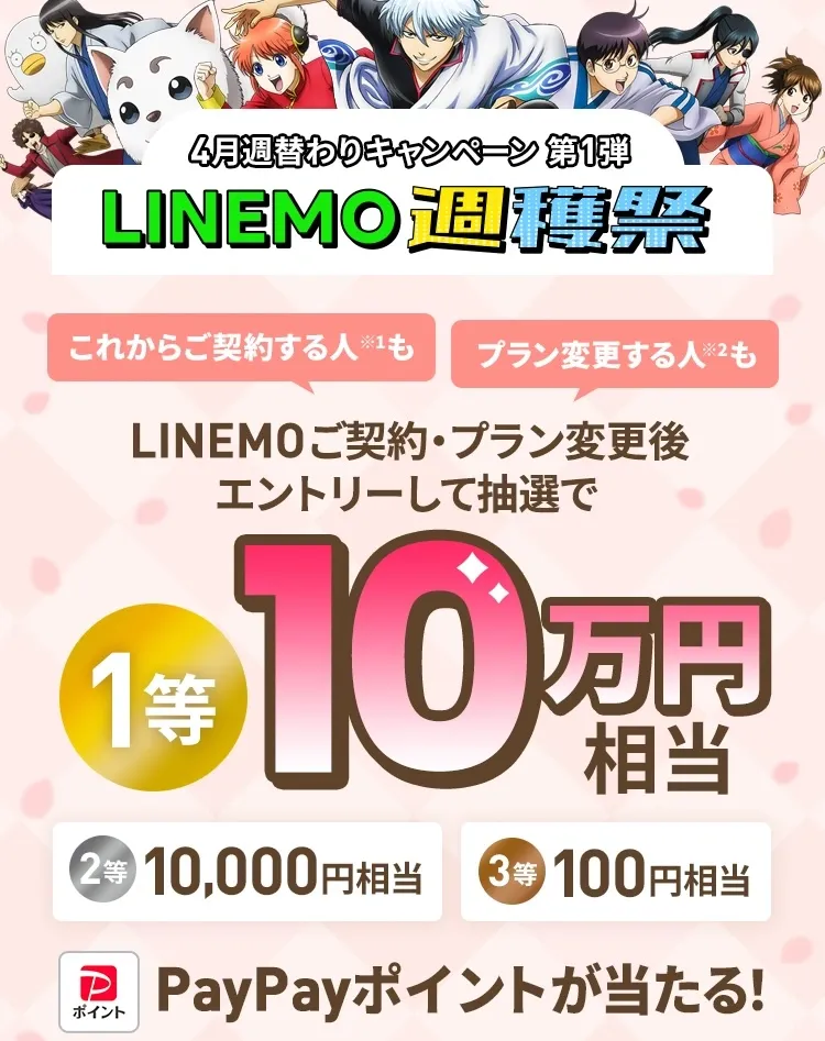 2026年4月6日(月)〜4月19日(日)の期間中、LINEMOの「週穫祭」では、抽選で最大10万円相当PayPayポイントが当たるキャンペーンを実施しています。