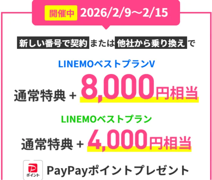 他社からLINEMOのベストプランVへ乗り換えで12,000円相当のPayPayポイントが貰えるキャンペーンを実施中です。