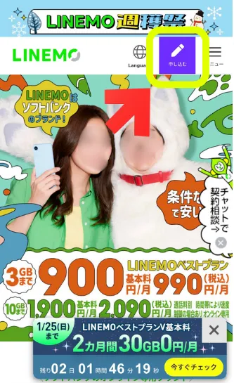 LINEMO公式サイトにアクセスして「申し込み」を選択します。