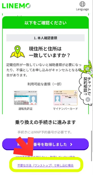 MNPワンストップなら、事前のMNP予約番号発行は不要です。LINEMOの申し込み画面から現在契約している通信会社のページへ自動で遷移するので、そのまますぐに番号移行の手続きができます。