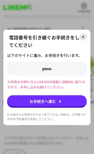 MNPワンストップ対応の通信会社から申し込みの場合、LINEMOの申し込み途中に現在契約している通信会社のマイページにリンクし乗り換え手続きを行います。