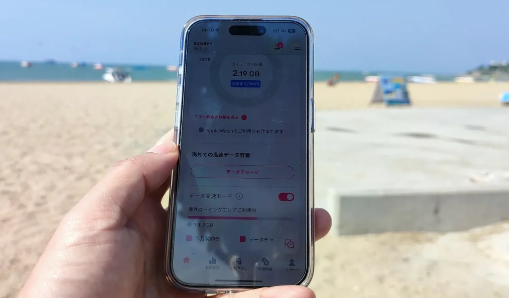 海外では楽天モバイルの「データローミング(2GBまで無料)」を活用し、国内ではLINEMOの3GBを使い切った時点で楽天モバイルに切り替えます。