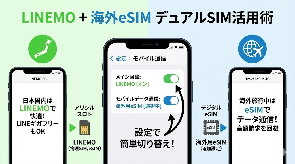 そこでおすすめなのが、LINEMOと「海外用eSIM」をデュアルSIMで併用する方法です。