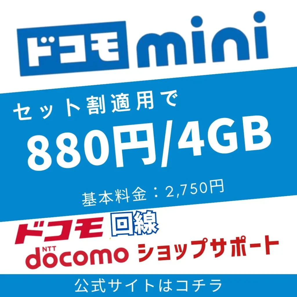 ドコモ miniはドコモブランドでありながら基本料金が定額に抑えられており、セット割が適用で4GB/880円〜利用できます。