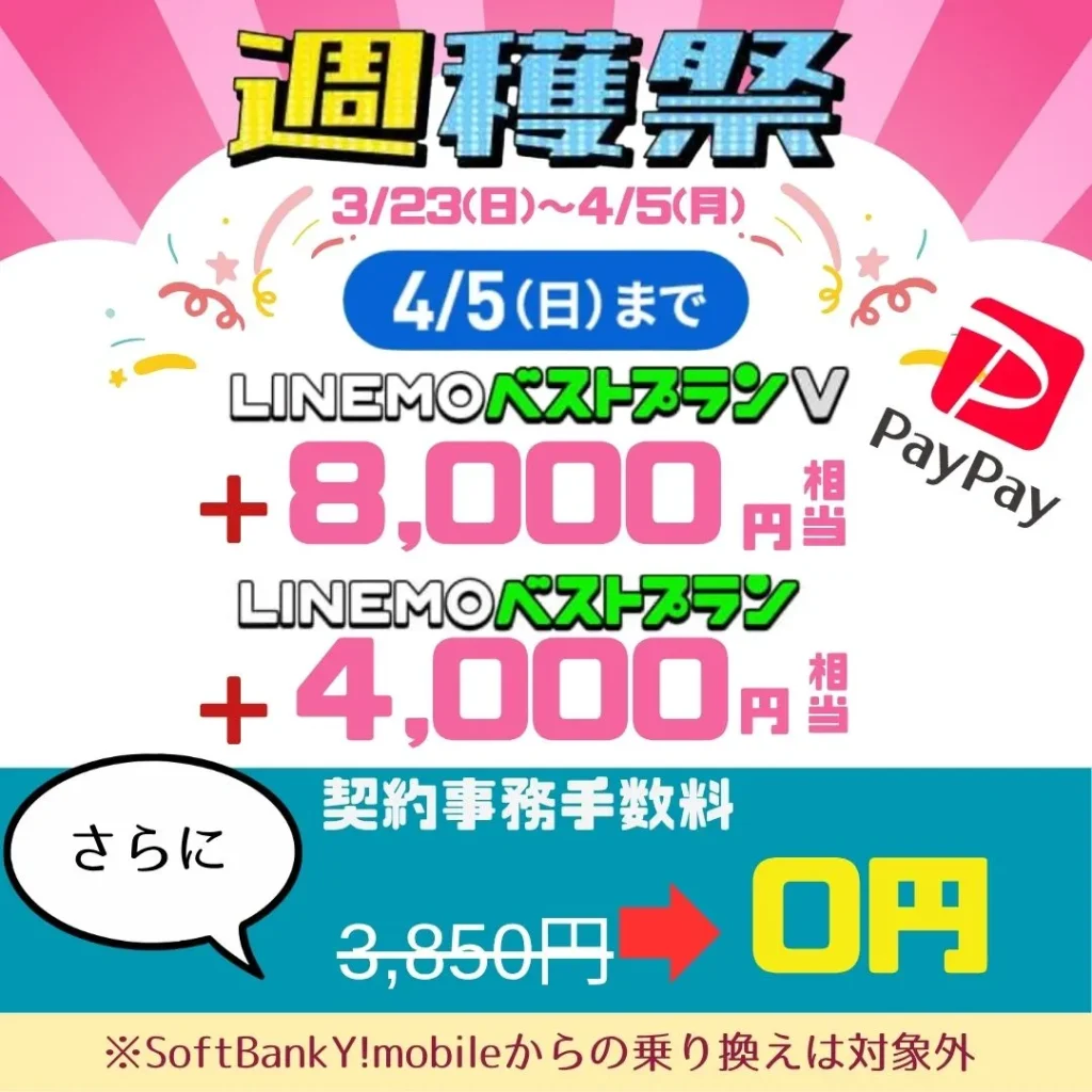 LINEMOでは、新規契約やMNPで乗り換えた方向けに、PayPayポイントが付与されるキャンペーンを実施しています。