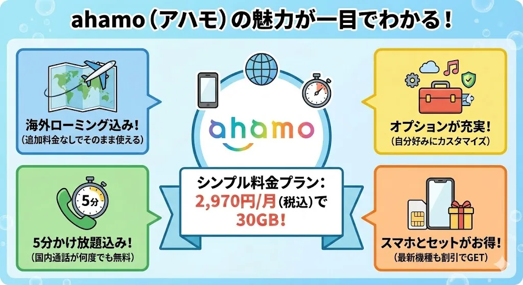 データの繰り越し機能や店舗サポート(無料)はなくなりますが、「5分通話定額」や「海外ローミング」が追加料金なしで使えるメリットは、ahamoだけの大きな強み。
